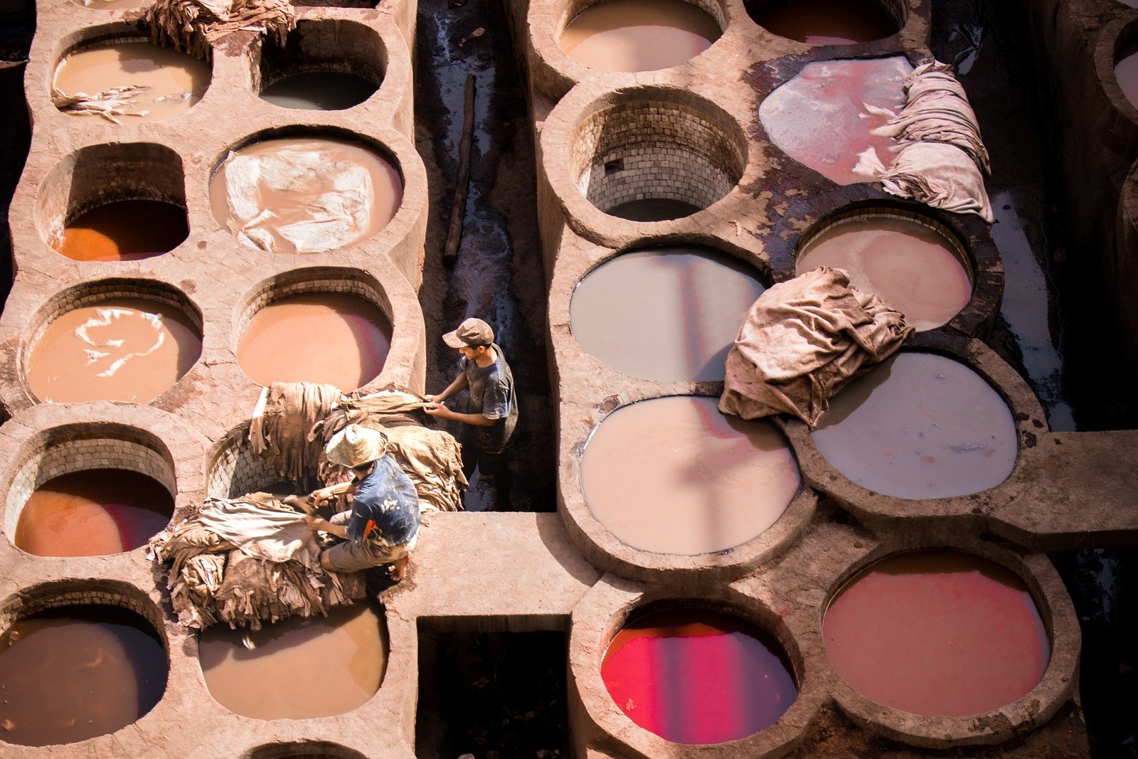 Moroccan leather is tanned using methods developed over centuries. Unlike industrial leather, traditional tanning relies entirely on natural resources and is performed manually. The steps include: