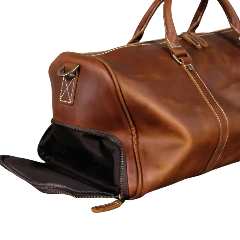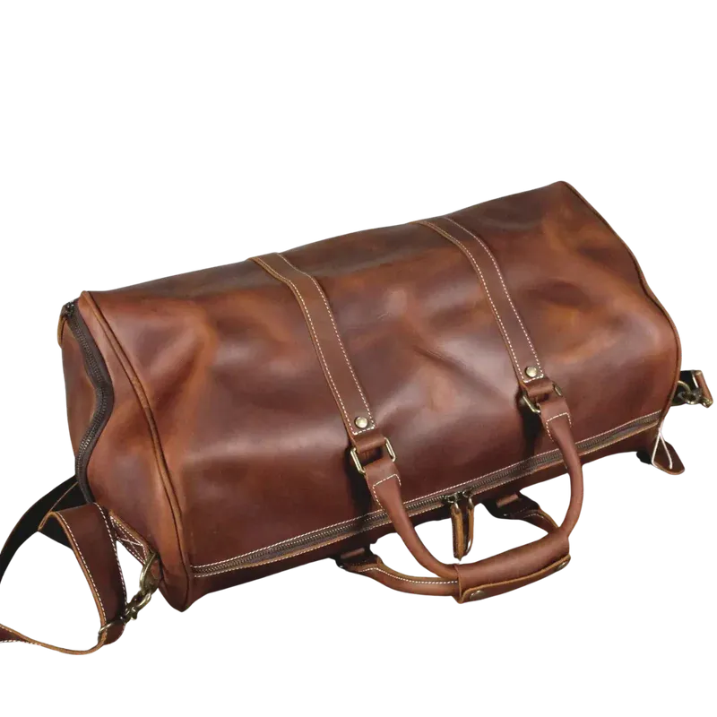 The Tewtiw duffel bag is a unisex travel essential, handcrafted from genuine buffalo leather in a rich cognac.