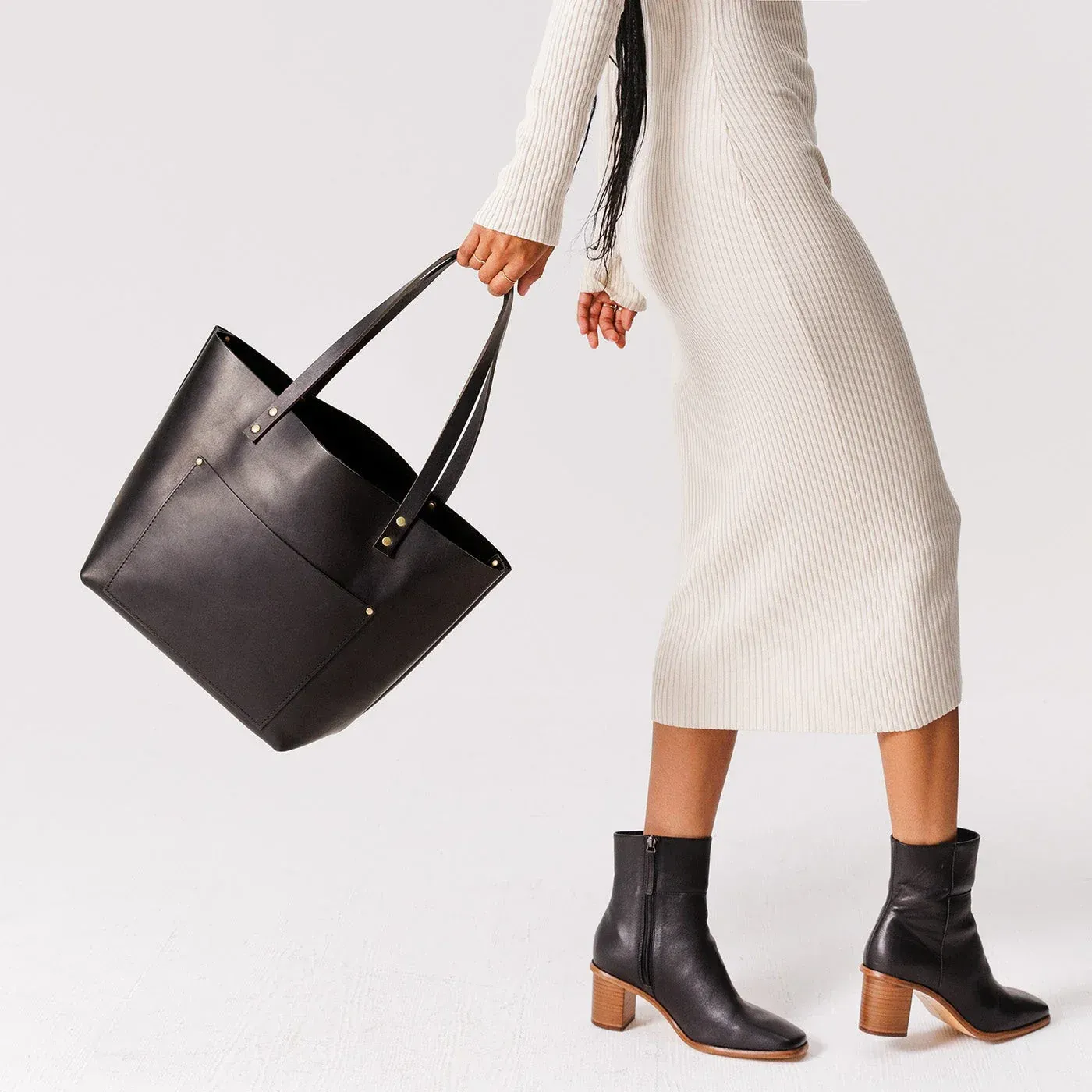 The Tewtiw women’s tote is handcrafted from full-grain buffalo leather in a soft black finish.